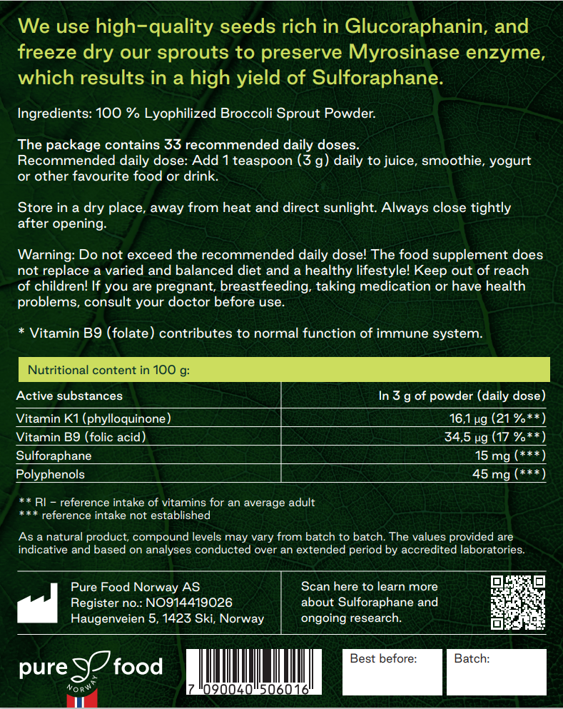 High-Potency Sulforaphane powder: The package contains 33 recommended daily doses of sulforaphane, offering an effective and concentrated dose to help you achieve your health goals.