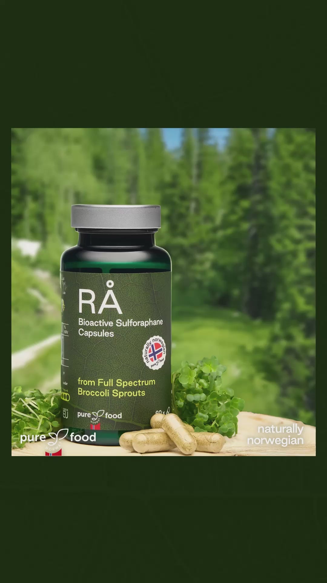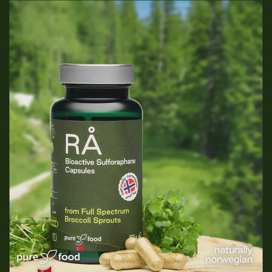 Organic Broccoli Sprouts: Our RÅ Bioactive Sulforaphane capsules deliver 950 mg of organic broccoli sprouts sourced from premium broccoli seeds. These sprouts are carefully cultivated in Norway to provide natural support for your health and wellness.